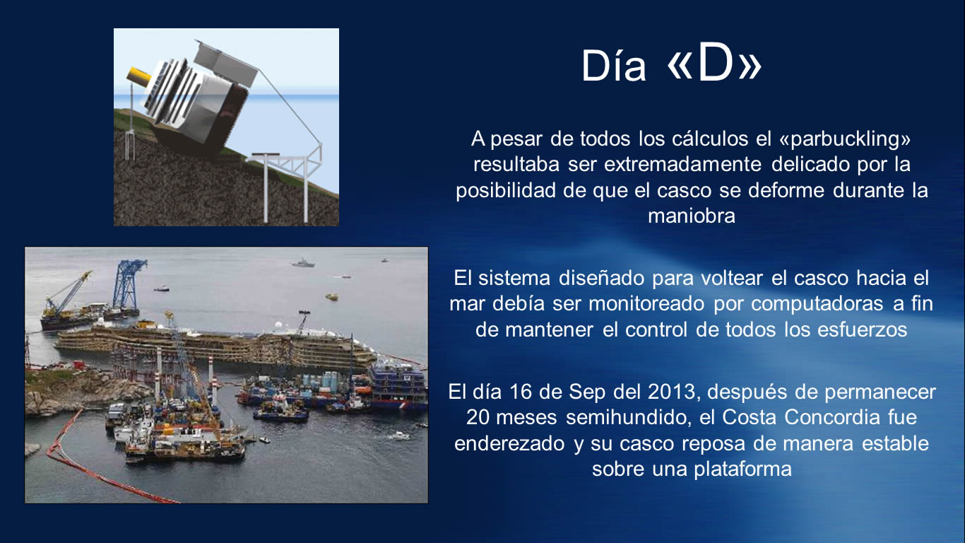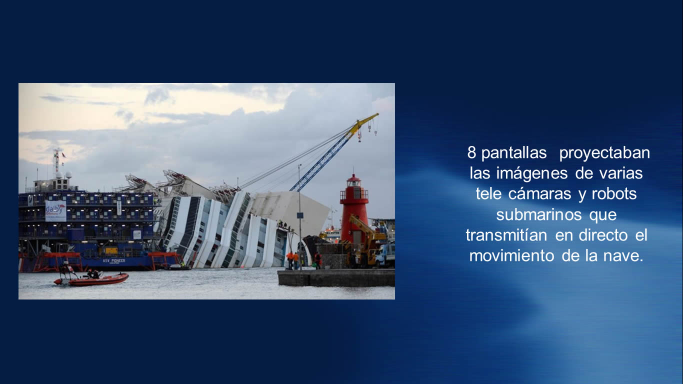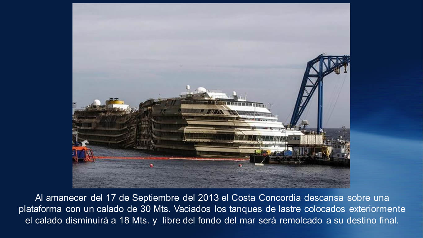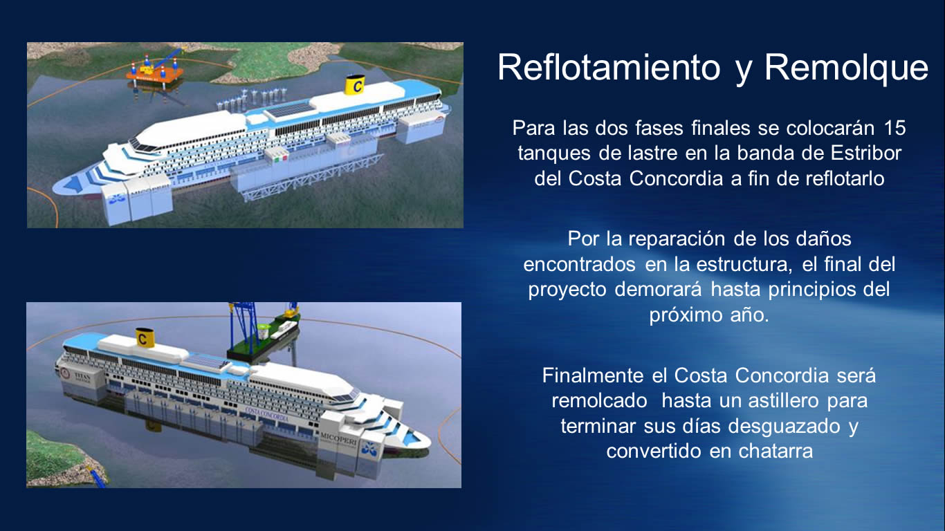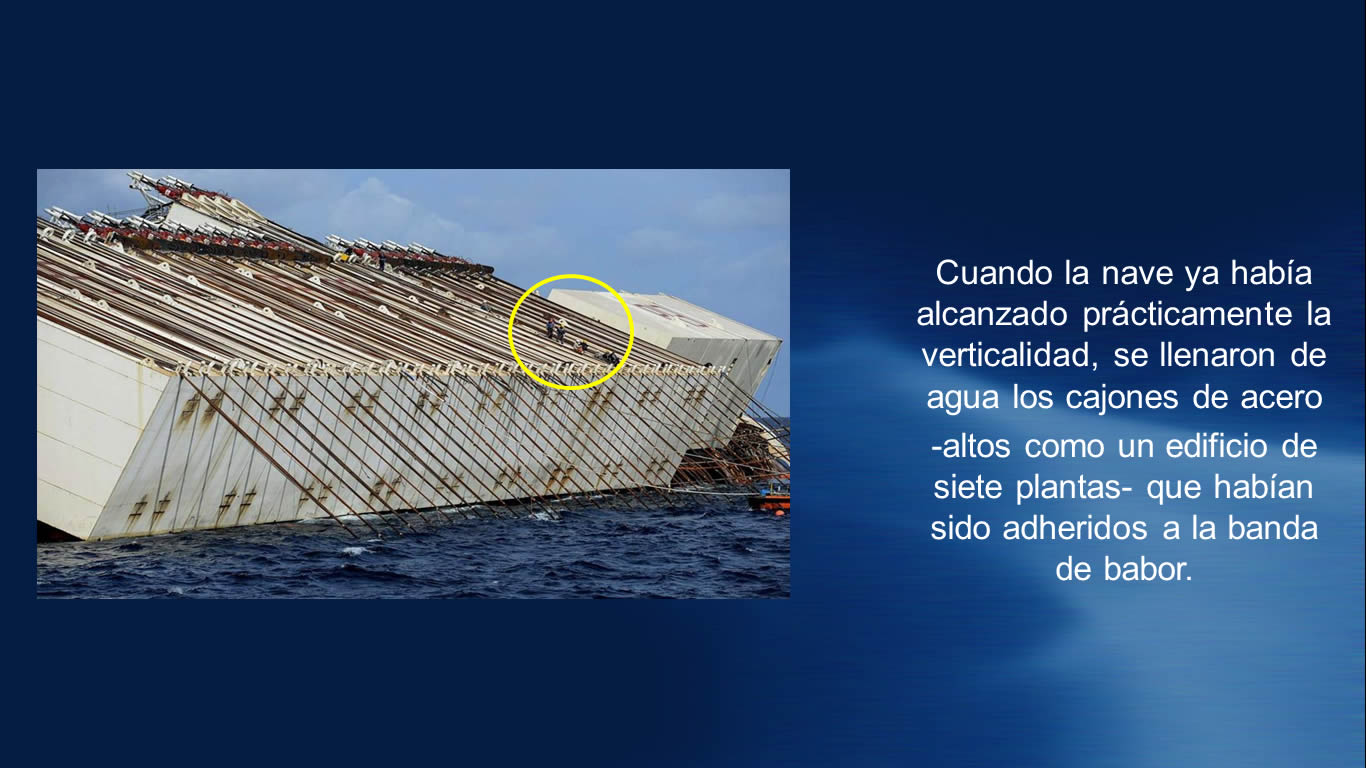Su semihundimiento el 13 de enero de 2012 y su reflotado culminado el 16 de septiembre de 2013 luego de una genial obra de ingeniería.