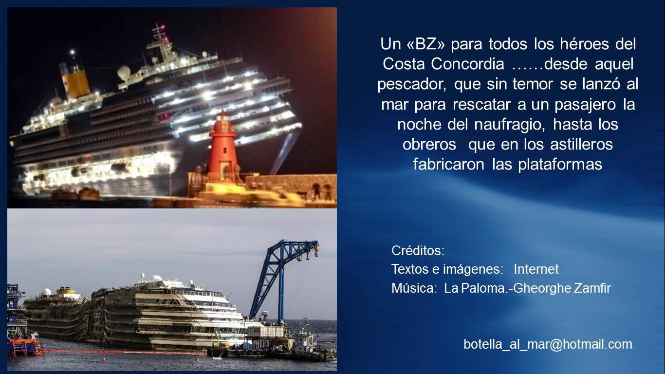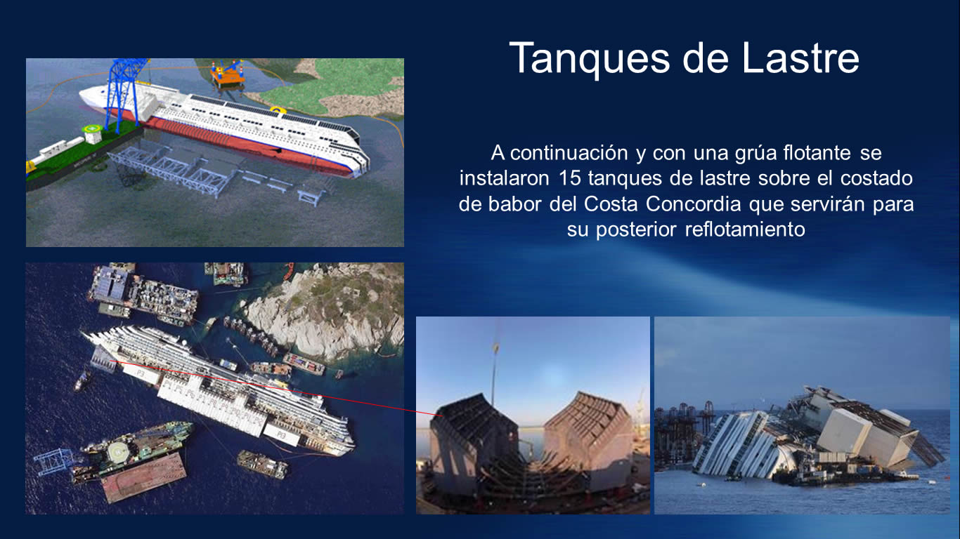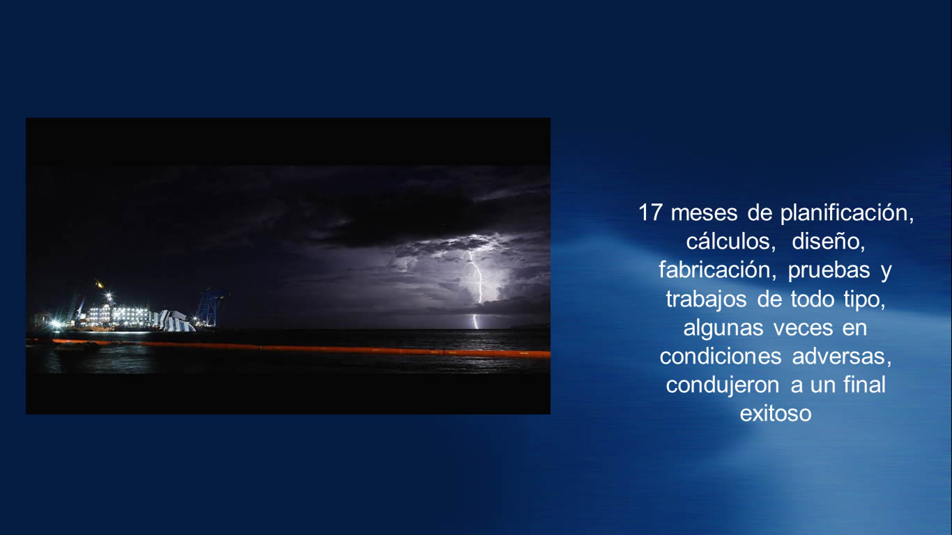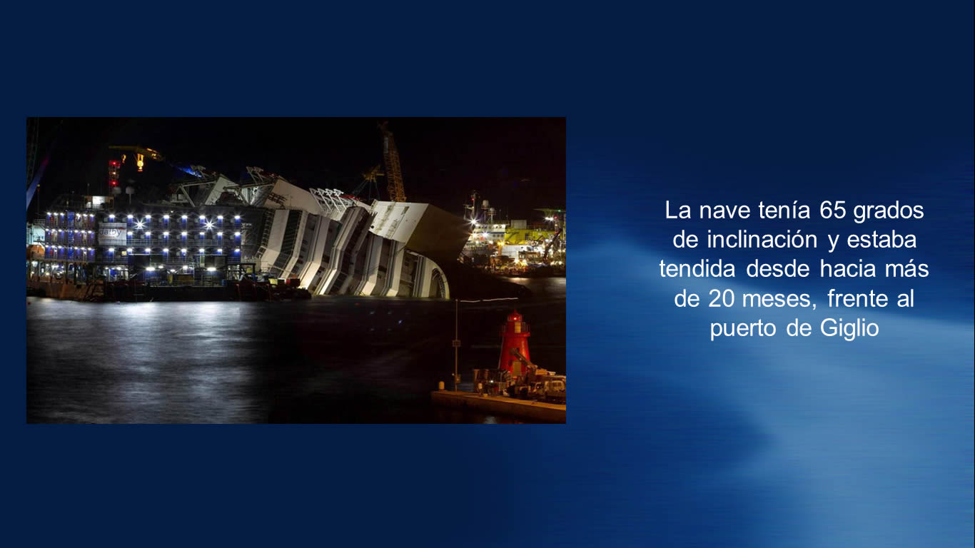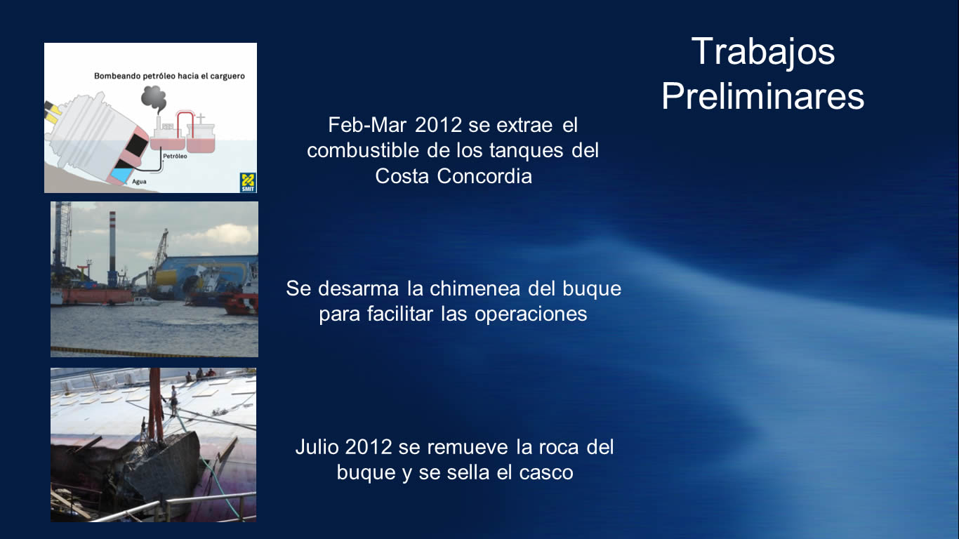 Su semihundimiento el 13 de enero de 2012 y su reflotado culminado el 16 de septiembre de 2013 luego de una genial obra de ingeniería.