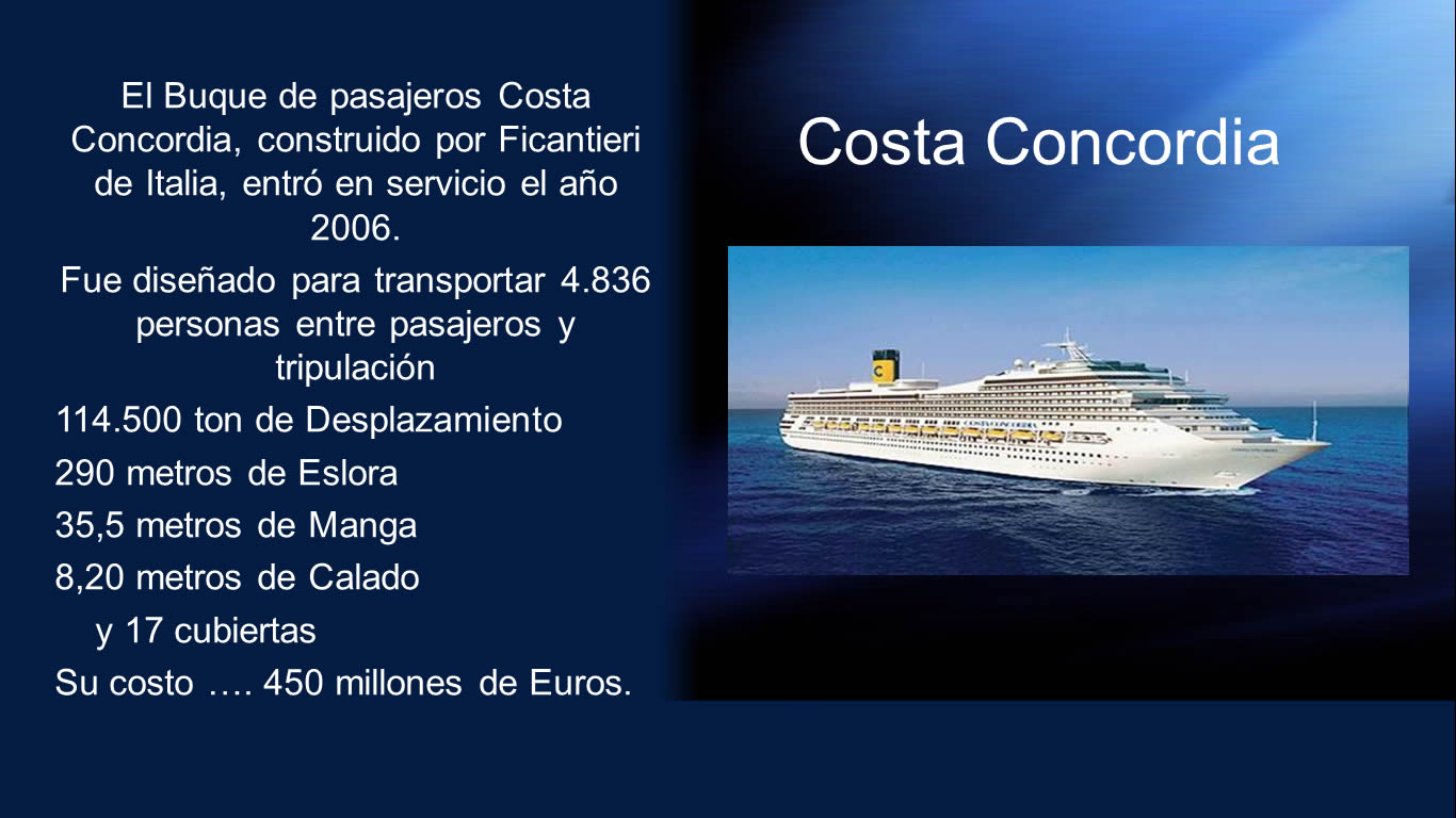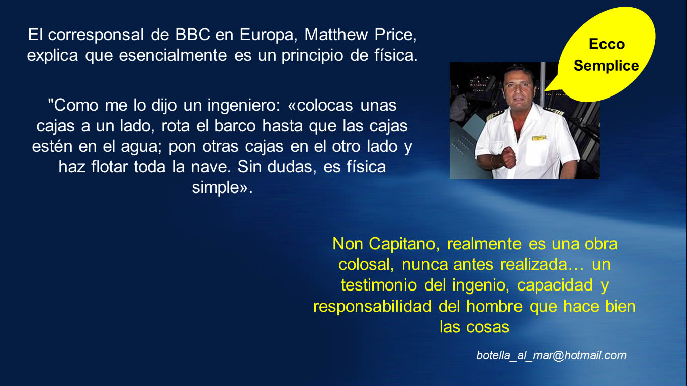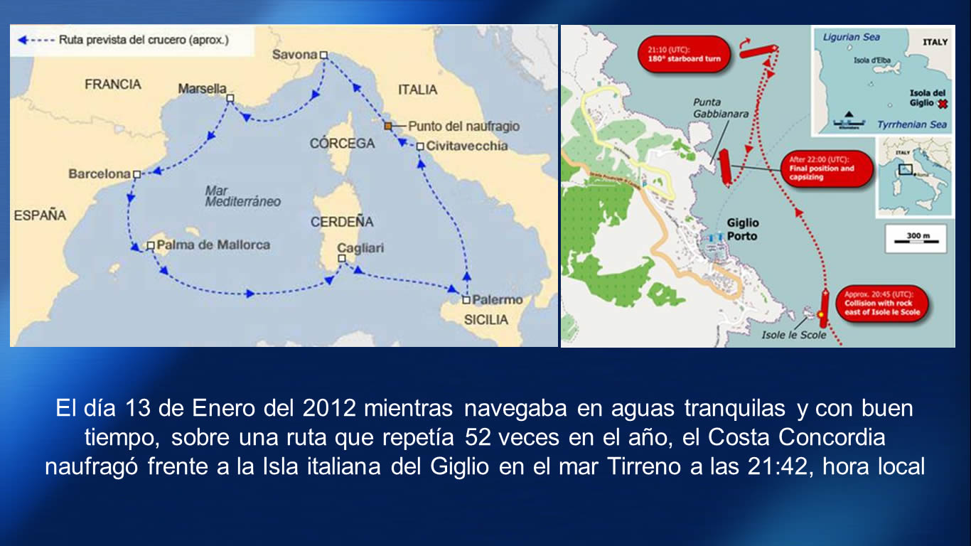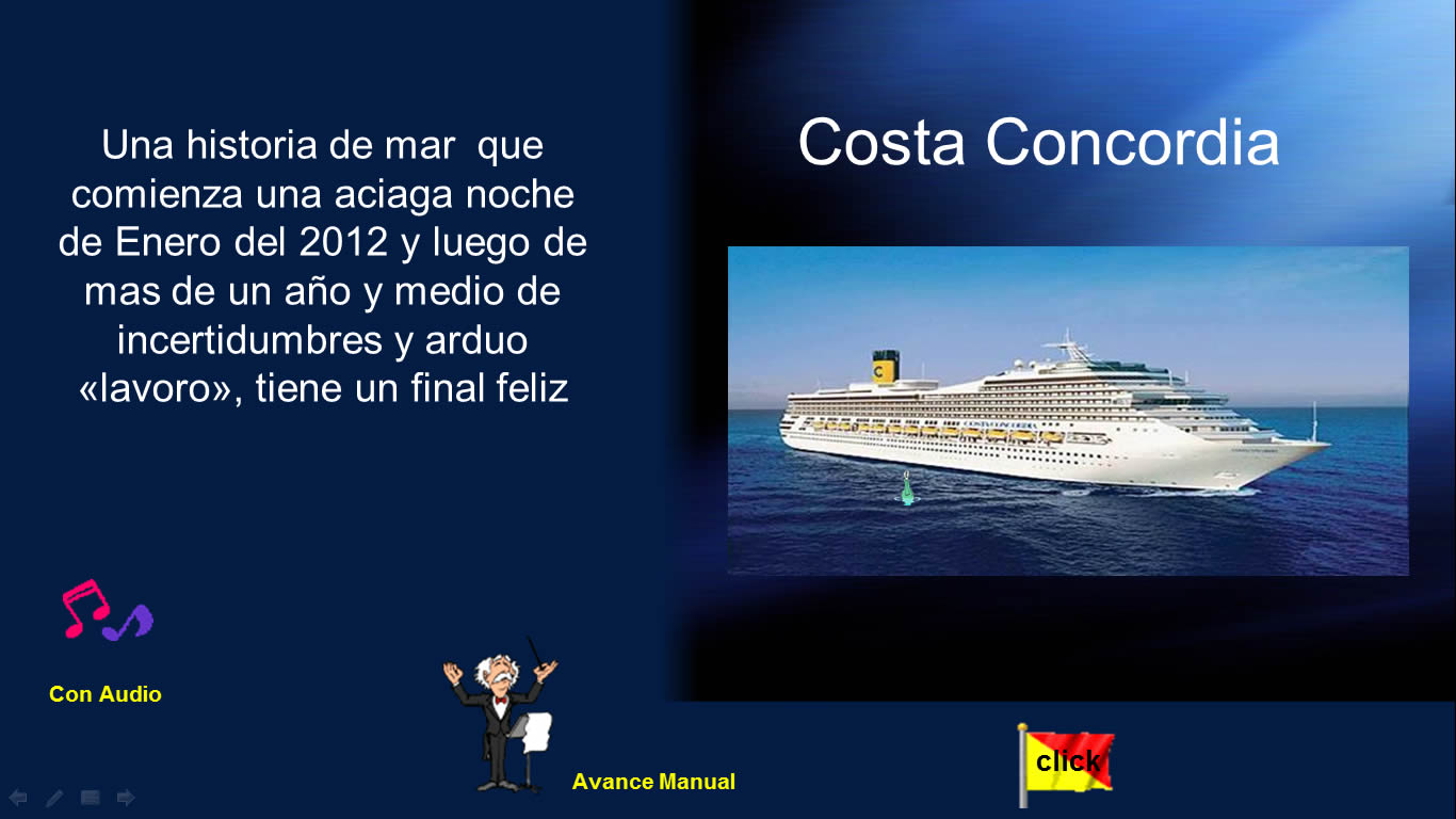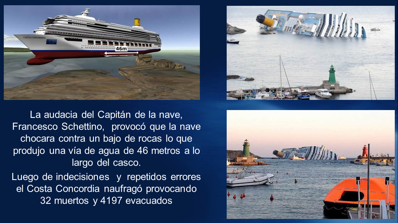 Su semihundimiento el 13 de enero de 2012 y su reflotado culminado el 16 de septiembre de 2013 luego de una genial obra de ingeniería.